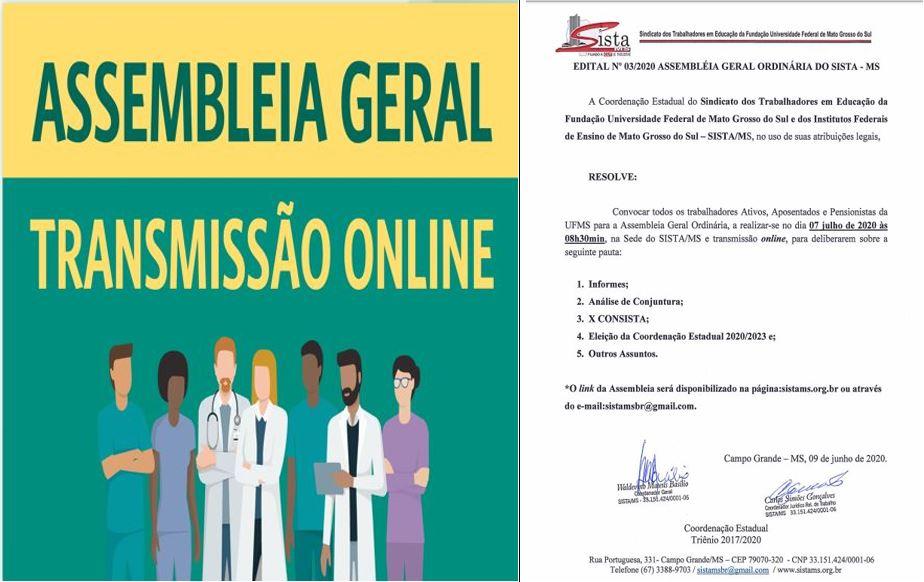 Convocar todos os trabalhadores Ativos, Aposentados e Pensionistas da UFMS para a Assembleia Geral Ordinária, a realizar-se no dia 7 DE JULHO de 2020 às 8h30, na sede do SISTA-MS e transmissão ONLINE, para deliberarem sobre a seguinte pauta: