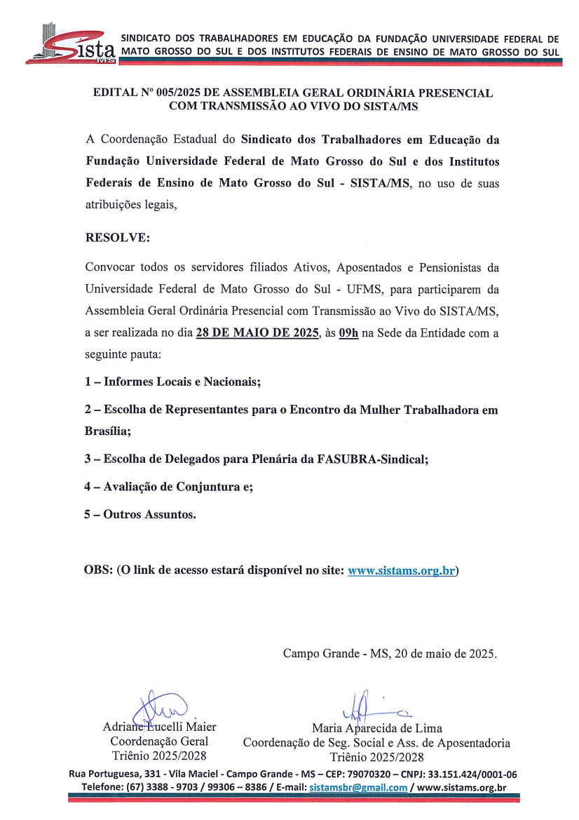 Edital nº 005-2025 - Assembleia Geral Ordinária Presencial com Transmissão ao Vivo do SISTA-MS