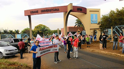 Da entrada da universidade, os técnicos se deslocaram depois para o Complexo Multiuso, onde foi realizado mais uma assembléia de greve.