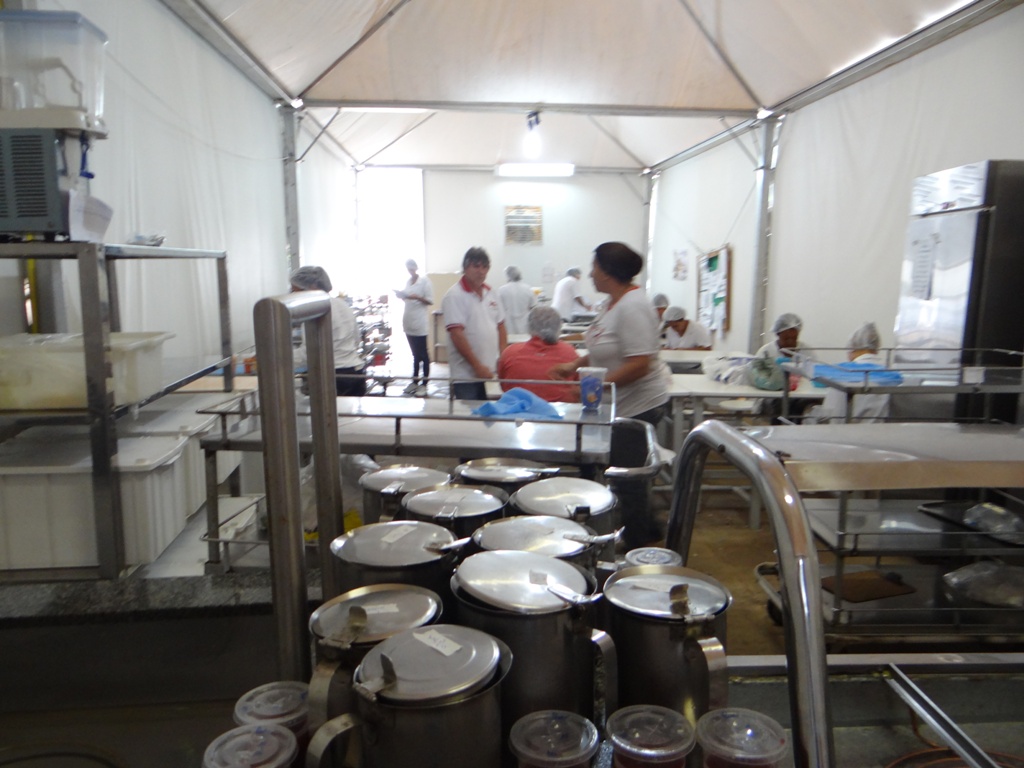 Trabalhadores ficaram um bom tempo transitando com carrinhos de alimentos sob sol e chuva, pois a a lona que ligava a tenda aos leitos simplesmente caiu