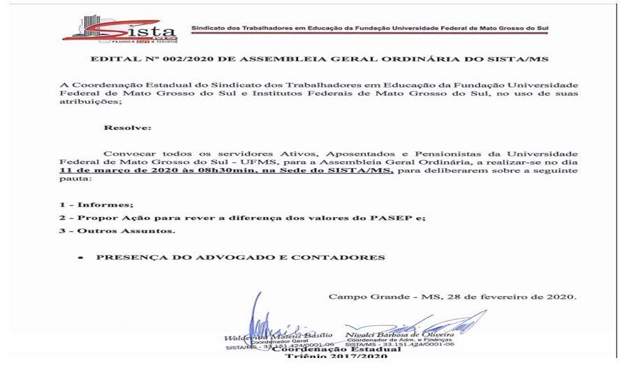 A Coordenação Estadual do Sindicato dos Trabalhadores em Educação da Fundação Universidade Federal de Mato Grosso do Sul e Institutos Federais de Mato Grosso do Sul – SISTA/MS, convoca todos os servidores ativos, aposentados e pensionistas da UFMS para uma ASSEMBLEIA GERAL ORDINÁRIA no dia 11 de março às 8h30 em sua sede para deliberarem sobre a seguinte pauta: