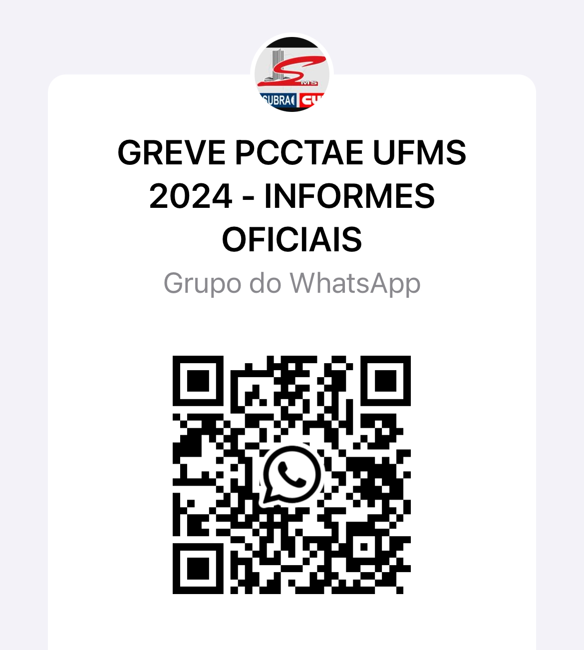 Trabalhadores técnicos-administrativos da UFMS, este é o grupo oficial do Comando Local de Greve para o repasse de informes, recados e outras comunicações. Fique sempre atento às nossas publicações nesse grupo.