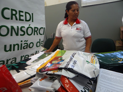 Bolsas têm estampas variadas e foram feitas a partir do reaproveitamento do material de publicidade da Sicredi Federal