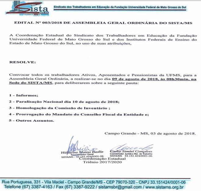 O SISTA-MS convoca todos os trabalhadores ativos, aposentados e pensionistas da UFMS para a Assembleia Geral Ordinária a realizar-se dia 9 de agosto às 8h30 na sede do sindicato para deliberar sobre a seguinte pauta: