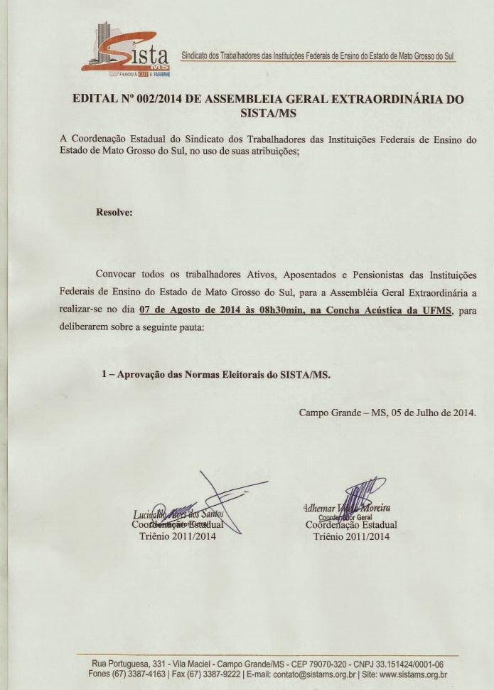 Convocar todos os trabalhadores Ativos, Aposentados e Pensionistas das Instituições Federais de Ensino do Estado de Mato Grosso do Sul, para a Assembleia Geral Extraordinária a realizar-se no dia