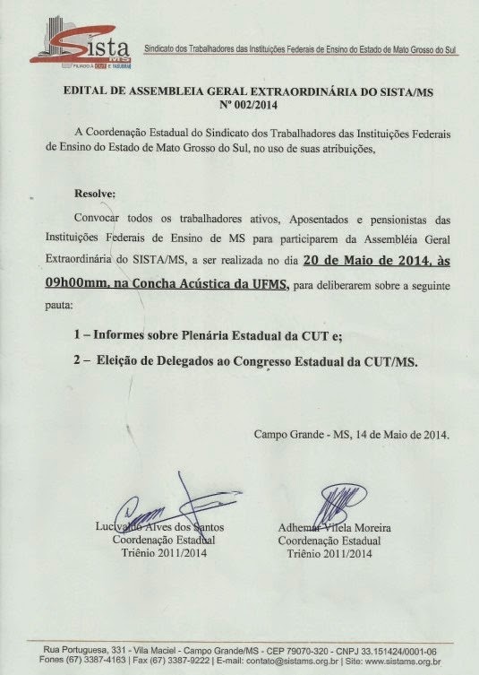 Convocar todos os trabalhadores ativos, Aposentados e pensionistas das Instituições Federais de Ensino de MS para participarem da Assembleia Geral Extraordinária do SISTA/MS, a ser realizada no dia