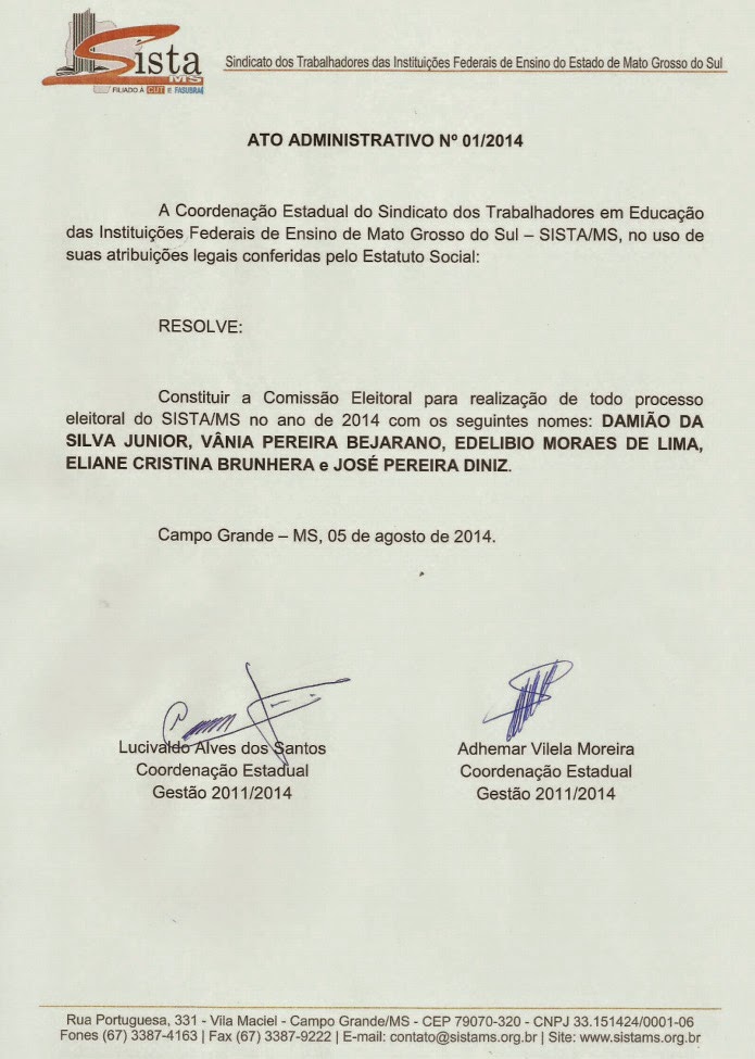 A Coordenação Estadual do Sindicato dos Trabalhadores das Instituições Federais de Ensino do Estado de Mato Grosso do Sul - SISTA/MS, no uso de suas atribuições legais conferidas pelo Estatuto Social: