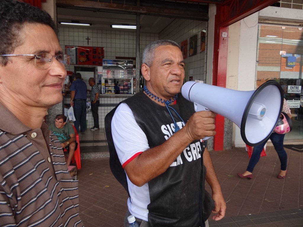Vasconcelos, da coordenação do SISTA, com o megafone em mãos explica os motivos da greve
