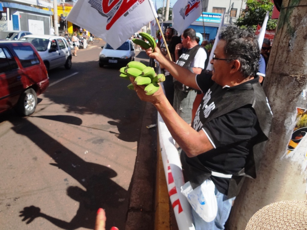 Numa protesto bem humorado, os servidores públicos federais em greve no MS distribuíram uma tonelada de banana para a população. A iniciativa chamou a atenção dos profissionais dos meios de comunicação que davam cobertura à manifestação e se transformou numa das atrações do ato dos trabalhadores.