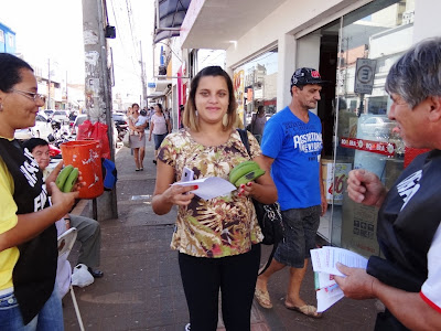 Os trabalhadores em educação da UFMS, presentes na manifestação, foram às ruas e abordaram as pessoas que passavam pelo Calçadão da Barão e também no cruzamento desta rua com a 14 de Julho, distribuindo bananas e pedindo apoio às reivindicações.