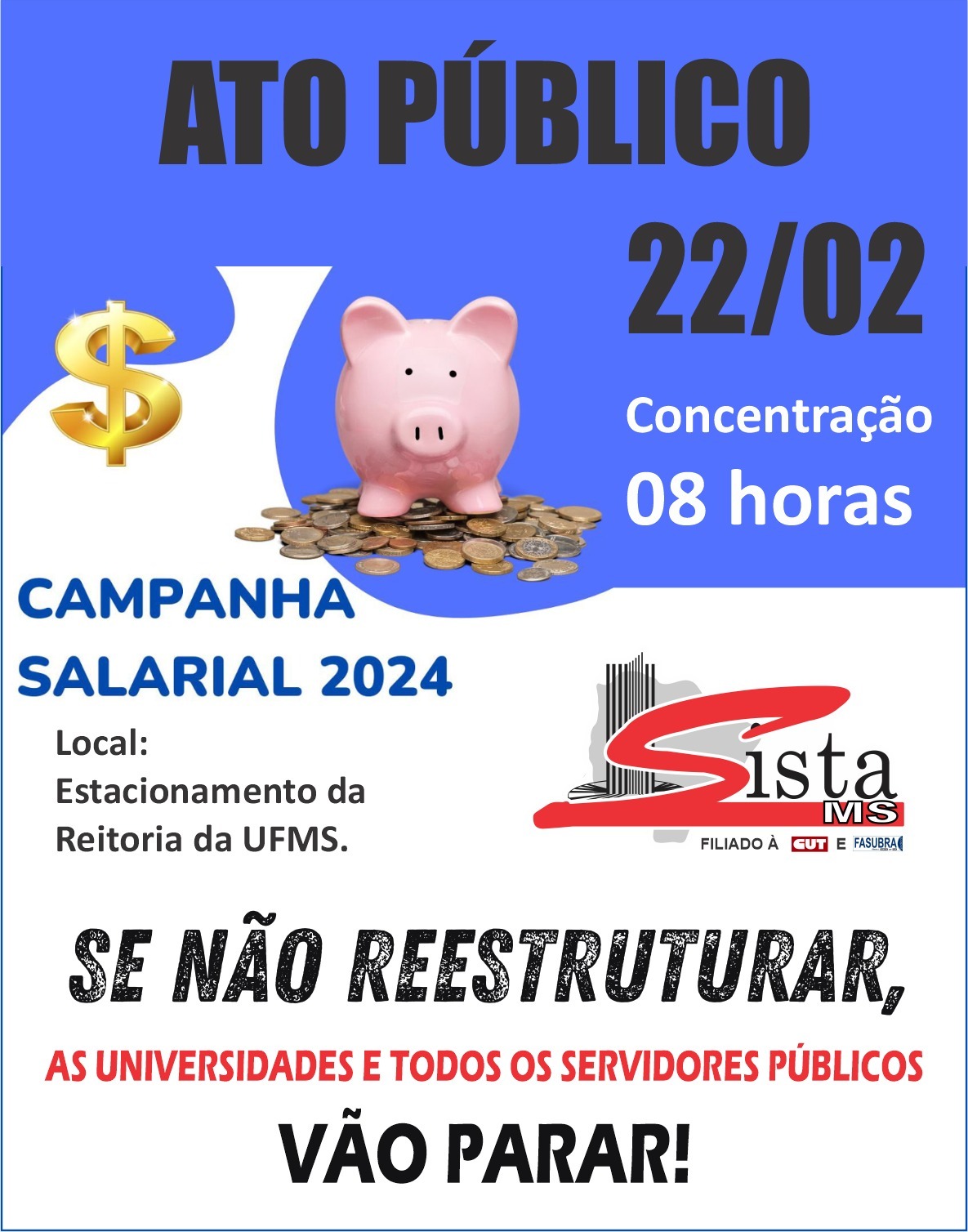 Na Assembleia realizada pelo SISTA-MS, no dia 05 de fevereiro, a categoria deliberou por um Ato Público no Estacionamento da Reitoria da UFMS, com início da concentração marcada para às 08 horas.