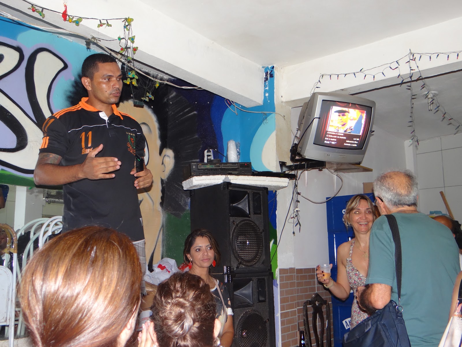 A delegação foi recepcionada num dos muitos espaços comerciais dentro da favela, transformado também em centro cultural e de resistência pelo rapper Fiell, um dos símbolos da luta na comunidade.