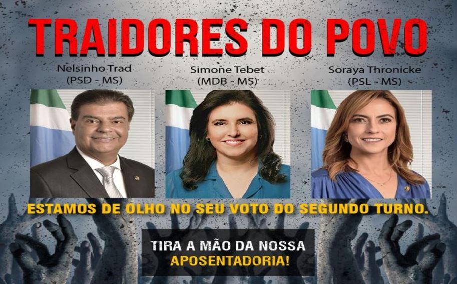 Veja quem são os senadores(as) de Mato Grosso do Sul que votaram a favor da reforma da Previdência e contra a aposentadoria dos trabalhadores(as): NELSINHO TRAD, SORAYA THRONICKE e SIMONE TEBET. Essa é uma campanha da FASUBRA de levantar os nomes de todos os parlamentares do Senado Federal, que estão trabalhando contra os interesses dos trabalhadores brasileiros e incentivar que toda comunidade tome conhecimento a respeito do procedimento deles que não respeitaram a vontade popular. Participe desse trabalho encampado pelo SISTA-MS  e denuncie esses parlamentares, compartilhando essa arte e o link dessa página em suas redes sociais.