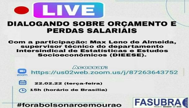 A FASUBRA Sindical (Federação dos servidores das universidades federais) promove, nesta terça-feira (22/2), às 15h, live com o tema “Dialogando sobre orçamento e perdas salariais”, com a participação de Max Leno de Almeida, supervisor técnico do Departamento Intersindical de Estatísticas e Estudos Socioeconômicos (Dieese).