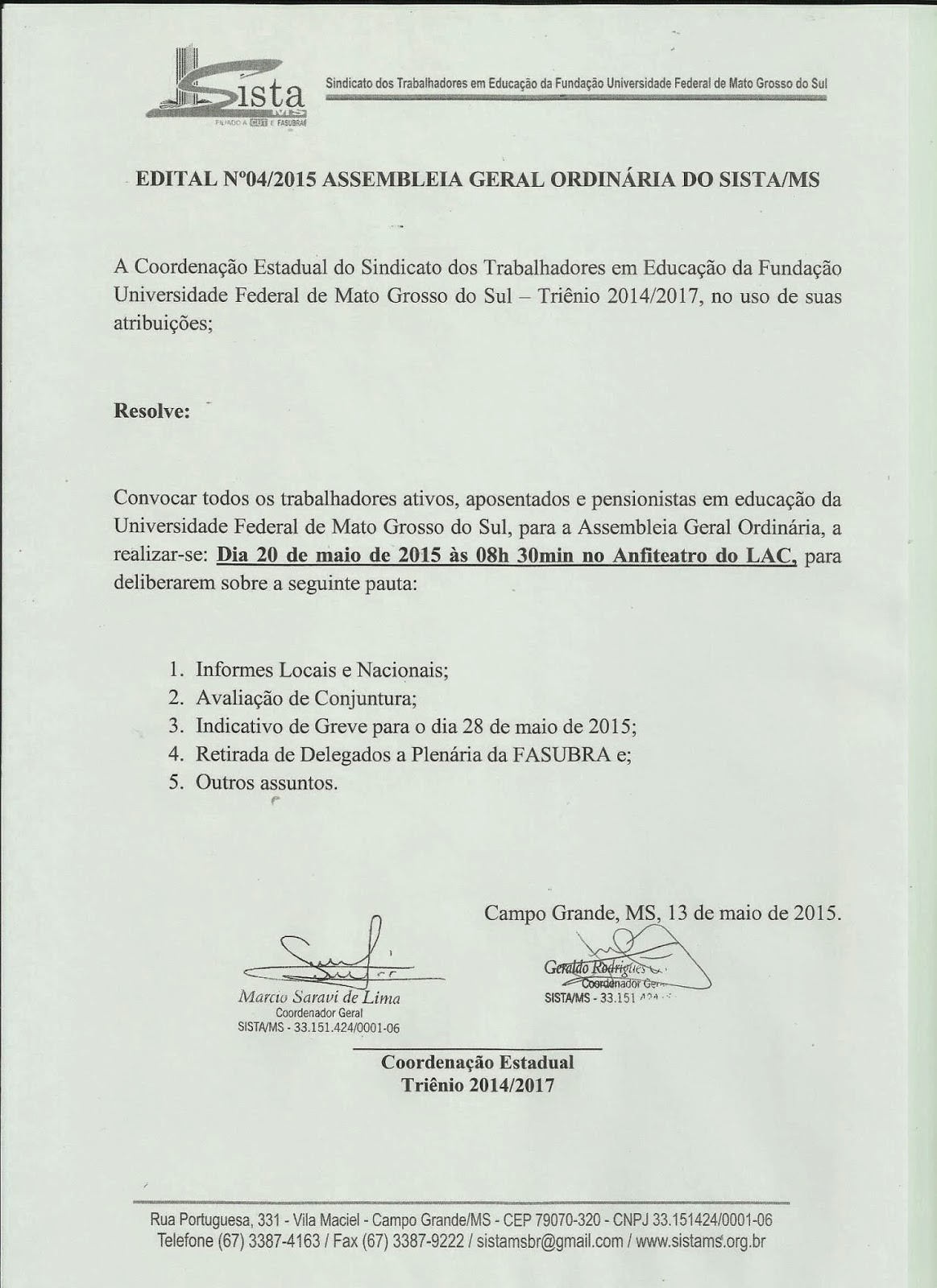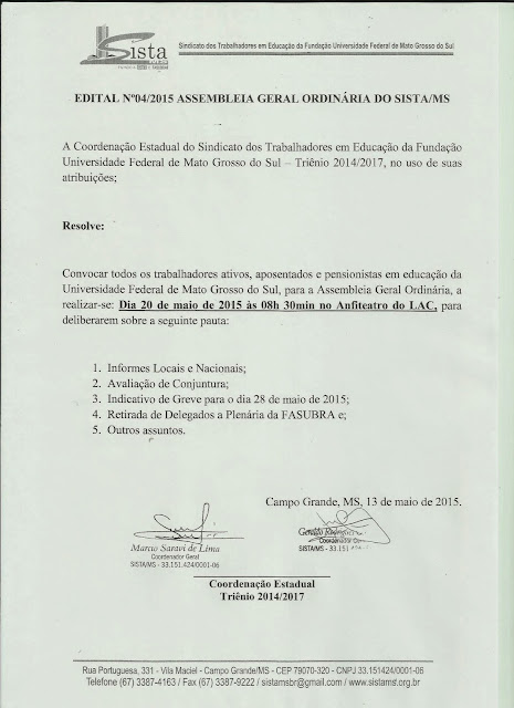 Edital 001/2026 -Assembleia Geral Extraordinária Presencial com transmissão ao vivo do SISTA-MS