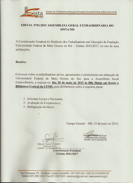 Edital 001/2026 -Assembleia Geral Extraordinária Presencial com transmissão ao vivo do SISTA-MS