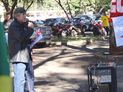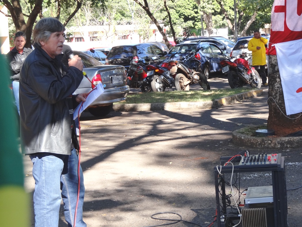 Luis Carlos Shibassaki, da secccional de Corumbá, fala na assembléia de greve na UFMS Campus do interior também mobilizados