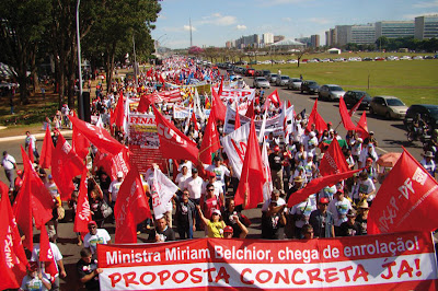 Uma verdadeira lição de democracia e unidade, foi o que representou a Marcha dos Servidores Públicos, realizada nesta terça-feira (05) na Esplanada dos Ministérios, em Brasília. A manifestação reuniu mais de 15 mil trabalhadores segundo informações das entidades organizadoras. A marcha foi puxada pela Federação dos Sindicatos dos Trabalhadores Técnico-administrativos das Universidades Brasileiras (FASUBRA). Técnico-administrativos, estudantes, professores e servidores participaram da manifestação que terminou em frente ao Ministério do Planejamento Orçamento e Gestão. A intenção é pressionar o governo para acelerar o processo de negociação das pendências e reivindicações das pautas sindicalistas e anunciar o calendário de greve das categorias, no caso da FASUBRA dia 11. A direção nacional da FASUBRA e as entidades filadas compareceram em massa. Para a coordenação da Federação o evento atingiu muito bem seus objetivos. “Além de demonstrar a força do movimento, a marcha foi excelente para que o governo tivesse sua atenção chamada para a nossa unidade e articulação, da mesma forma, a sociedade também teve oportunidade de tomar conhecimento, por meio da ampla cobertura da imprensa, das dificuldades que os trabalhadores estão passando nesse processo de negociação”, comemorou a coordenação. (Fonte: Fasubra)