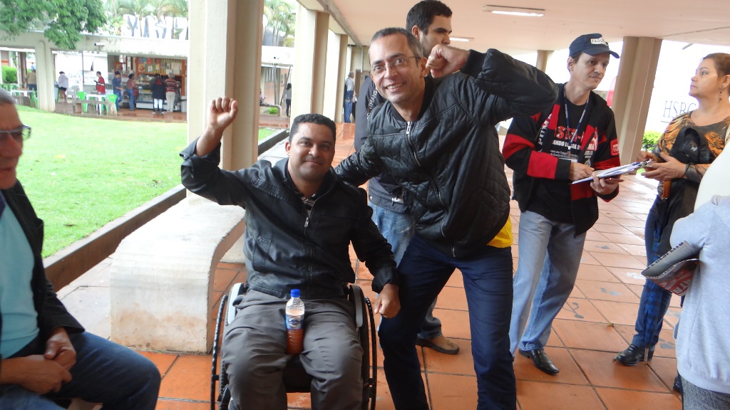A luta une!!! A greve 2015 da UFMS, além de promover o encontro e reencontro de colegas de trabalho, realiza também a inclusão das pessoas com deficiência, que são "abraçados" pelos demais como símbolo da luta, dignidade e superação. É o caso dos trabalhadores deficientes Ancelmo Quintana (cadeirante) e Édio Tadeu Leite (surdo), que são eficientes na luta e mostram toda dignidade pessoal, pois não deixam que os outros façam a sua luta por melhores condições de salário e trabalho.