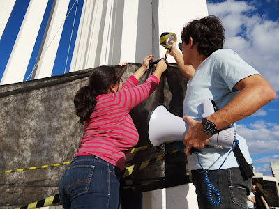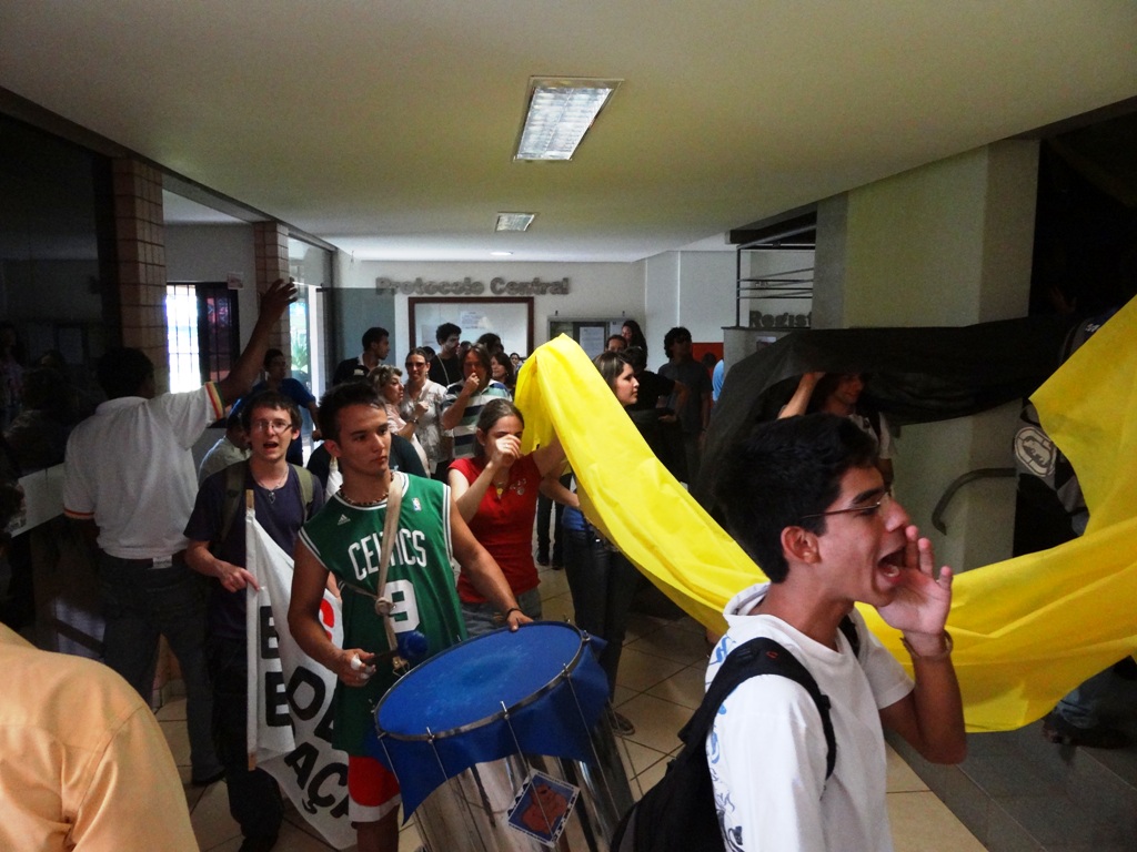 Do LAC, já com o apoio dos professores na passeata, os manifestantes passaram pelas Pró-Reitorias e em seguida até o “paliteiro”, em frente ao prédio da Biblioteca Central. Depois de passarem a faixa em volta do símbolo da UFMS, os manifestantes fizeram um minuto de silêncio em protesto pela morte da educação.