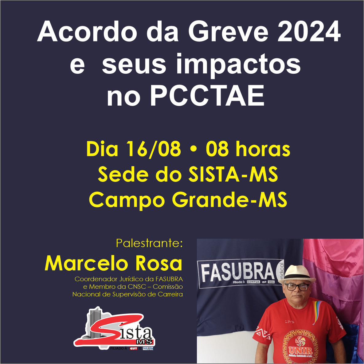 Com estagio atual dos Grupos de Trabalho que dão seguimento aos do Acordo de Greve de 2024, estará na cidade de Campo Grande-MS, no dia 16 de agosto de 2024, na Sede do SISTA-MS, a partir de 08 h, o Coordenador Jurídico e Relações de FASUBRA, Marcelo Rosa Pereira. O principal motivo da vinda dele ao nosso Estado é apresentar in loco informações dos trabalhos em andamento, na Comissão de Supervisão da Carreira (CNSC/MEC), após o encerramento da greve.