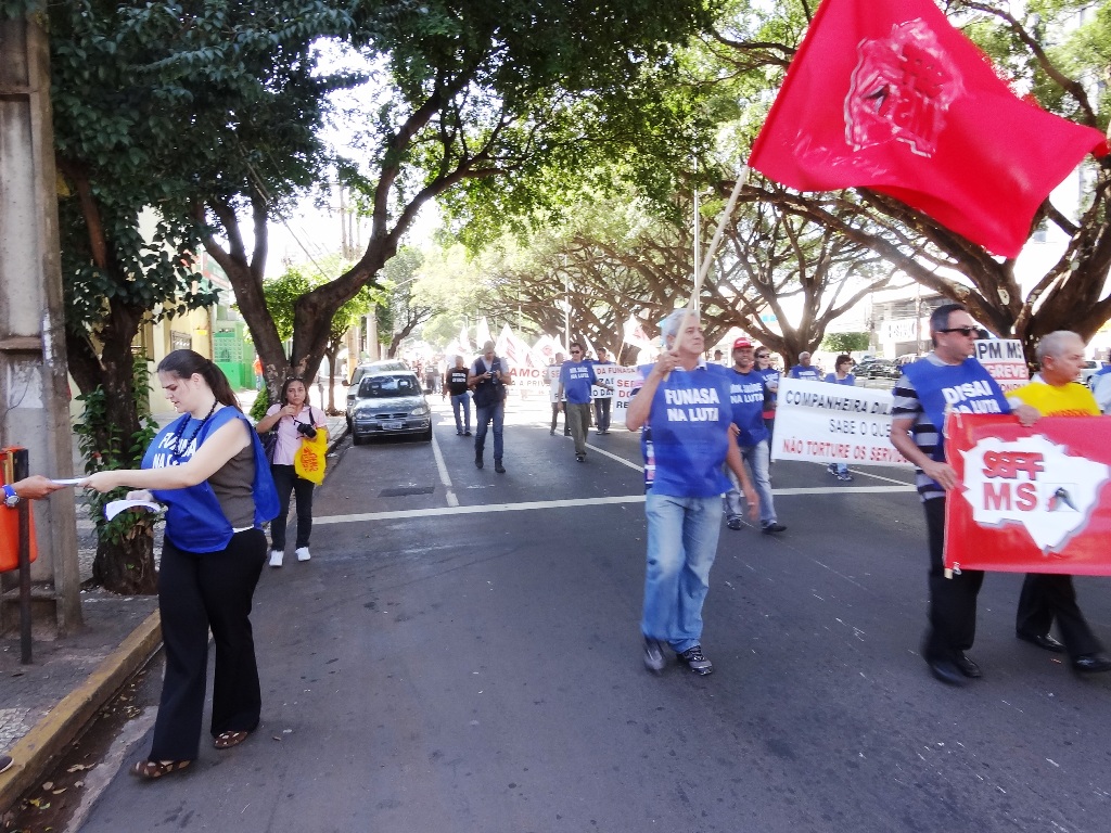 A manifestação conjunta dos servidores f4ederais em greve acontece na manhã desta quinta-feira (9) no centro de Campo Grande. A concentração ocorreu na Praça do Rádio Clube e depois centenas de trabalhadores saíram em passeata pela avenida Afonso Pena, principal via da capital.