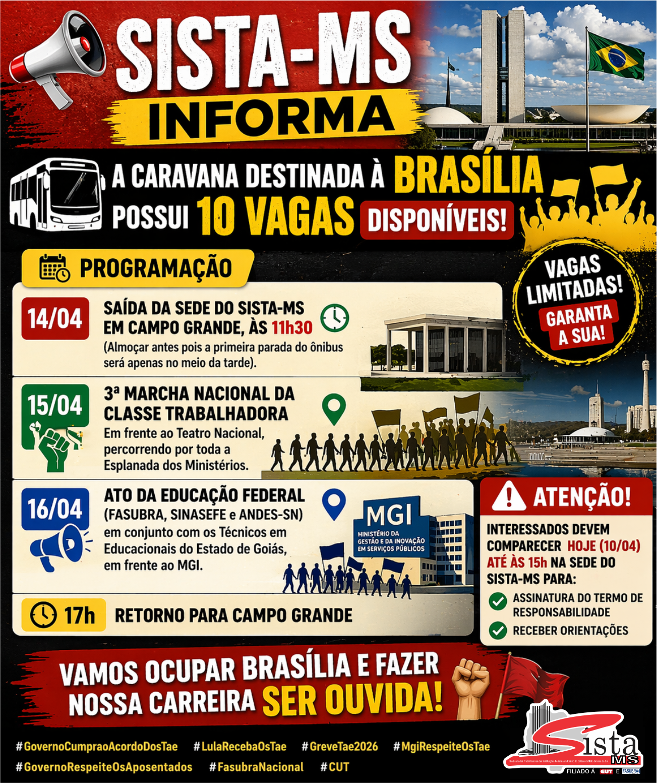 14/04 - Saída da sede do Sista-MS em Campo Grande, as 11:30 horas (almocem antes pois a primeira parada do ônibus será apenas no meio da tarde).