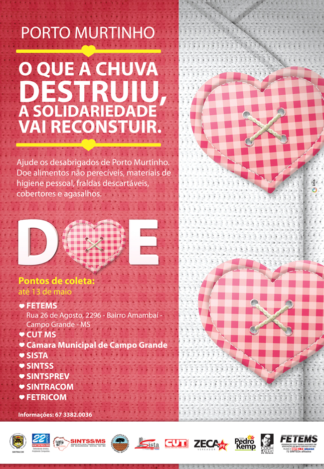 Os movimentos sindicais e algumas lideranças políticas de Mato Grosso do Sul se uniram e lançaram a campanha “O que a chuva destruiu a solidariedade vai reconstruir”, com o objetivo de ajudar as mais de 12 mil pessoas que foram afetadas e tiveram perdas materiais significativas, após a enchente ocorrida, no último mês, no município de Porto Murtinho.O objetivo é arrecadar alimentos não perecíveis, materiais de higiene pessoal, fraldas descartáveis, cobertores e agasalhos, até o dia 13 de maio. Os principais pontos de coleta são a sede da FETEMS (Federação dos Trabalhadores em Educação de Mato Grosso do Sul), à Rua 26 de agosto, n° 2296, Bairro Amambaí, atrás do Hotel Vale Verde (localizado na Afonso Pena), e na Câmara Municipal de Campo Grande, à Av. Ricardo Brandão, n° 1600, Parque Jatiuca. A campanha está sendo realizada pelos seguintes sindicatos e lideranças políticas: FETEMS (Federação dos Trabalhadores em Educação de Mato Grosso do Sul), CUT/MS (Central Única dos Trabalhadores de Mato Grosso do Sul), SISTA (Sindicato dos Trabalhadores das Instituições Federais de Ensino de Mato Grosso do Sul), SINTSS (Sindicato dos Trabalhadores em Seguridade Social de Mato Grosso do Sul), SINTSPREV (Sindicato dos Trabalhadores Públicos em Saúde, Trabalho e Previdência no Estado de Mato Grosso do Sul), FETRICOM (Federação dos Trabalhadores nas Indústrias da Construção, Mobiliário e Montagem Industrial do Mato Grosso do Sul), SINTRACOM (Sindicato dos Trabalhadores nas Indústrias da Construção Civil de Campo Grande), CDDH (Centro de Direitos Humanos Marçal de Souza), vereador Zeca do PT e deputado estadual Pedro Kemp.Os donativos também podem ser entregues em qualquer uma das sedes dos sindicatos envolvidos na campanha, listados acima. Se pessoas do interior quiserem fazer doações é só entrar em contato pelo (067) 3382-0036 (FETEMS), mais informações também podem ser obtidas nesse telefone.(Fonte: Fetems)