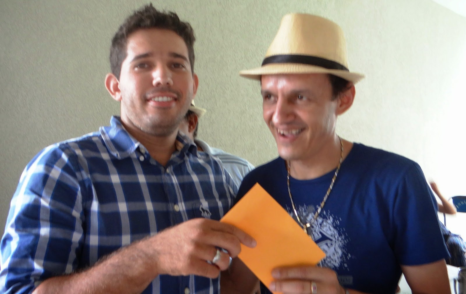 Thiago recebe seu bonus das mãos de Márcio Saravi, da coordenação geral