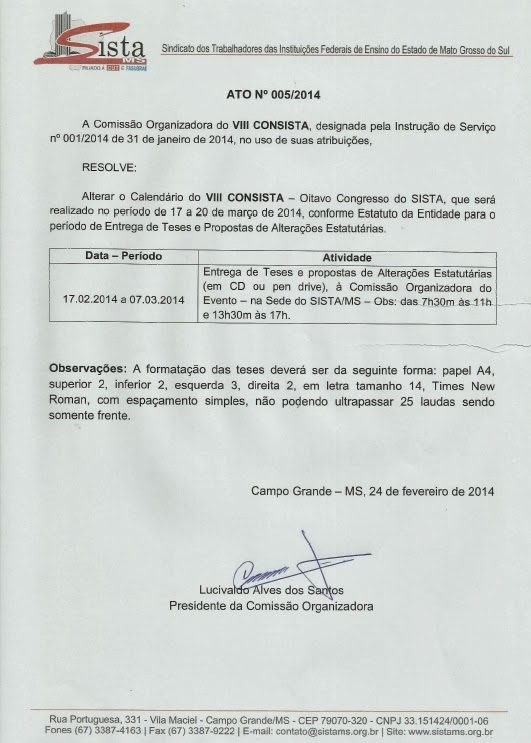 Alteração do período de Entrega de Teses e Propostas de Alterações Estatutárias (em CD ou pen drive), à Comissão Organizadora do Evento.