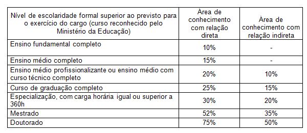 Com a nova Lei, o servidor técnico administrativo das instituições federais de ensino vinculadas ao Ministério da Educação, poderá solicitar o incentivo à qualificação, com base no nível de escolaridade formal superior ao previsto para o exercício do cargo (curso reconhecido pelo Ministério da Educação), independente da classe a que pertença. Isso quer dizer, por exemplo, que um servidor com doutorado, em área do conhecimento com relação direta ao cargo que ocupa, independente do nível, poderá solicitar o incentivo de 75% sobre o padrão de vencimento. Também preve acréscimo em alguns percentuais: o curso de graduação completo passa de 10 para 25% e a especialização de 27 para 30%.