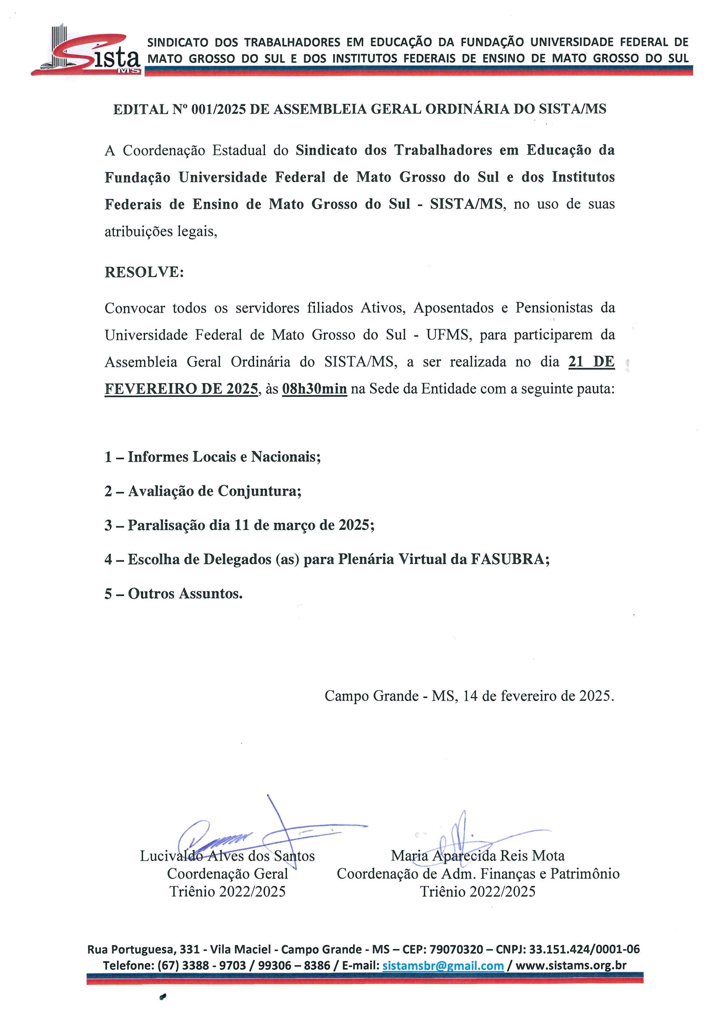 EDITAL N. 010/2025 DE ASSEMBLEIA GERAL ORDINÁRIA - PRESENCIAL COM GRANSMISSÃO AO VIVO DO SISTA-MS