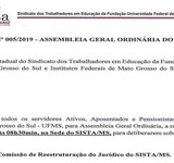SISTA convoca servidores ativos, aposentados e pensionistas da UFMS e Institutos Federais de Educação de MS para ASSEMBLEIA GERAL na terça-feira, DIA 11 de junho às 8h30