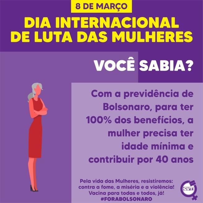 Na luta pela vida e por condições dignas de sobrevivência, com o mote “Pela Vida das Mulheres, Resistiremos: contra a fome, a miséria e a violência! vacina para todas e todos, já e Fora Bolsonaro”, as mulheres, a CUT, os movimentos sociais, sindical e feministas vão fazer no próximo dia 8 de março, data que se celebra o Dia Internacional da Mulher, atos, diálogos e denúncias sobre a situação das mulheres em todo o país.