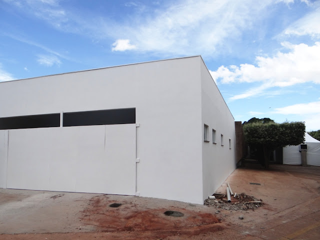O prédio da Nutrição que estava em reforma já com o buraco na calçada para colocação de placa de identificação do PAM. Ao fundo, a tenda onde está acampado o setor de Nutrição