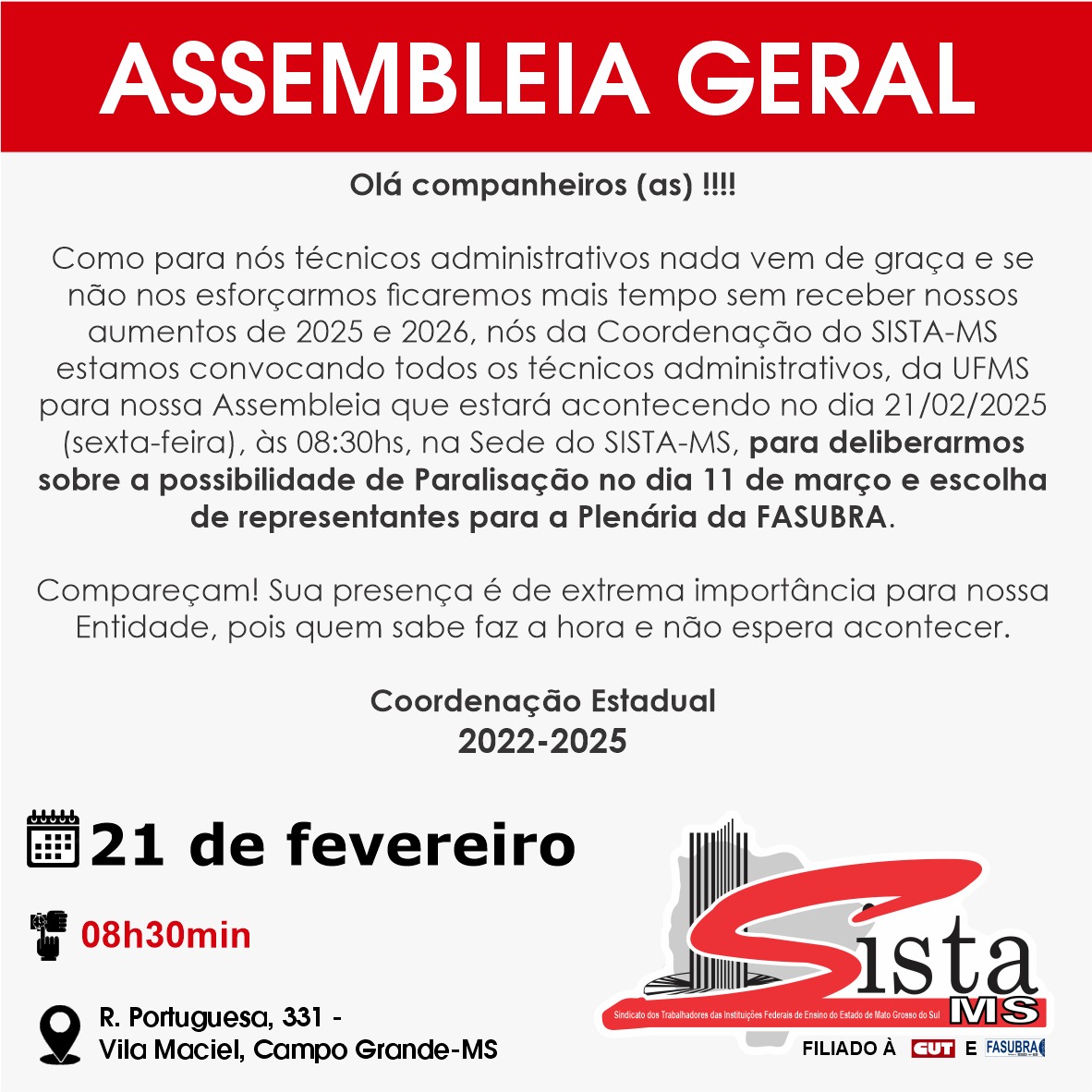 Como para nós técnicos administrativos nada vem de graça e se não nos esforçarmos ficaremos mais tempo sem receber nossos aumentos de 2025 e 2026, nós da Coordenação do SISTA-MS estamos convocando todos os técnicos administrativos, da UFMS para nossa Assembleia que estará acontecendo no dia 21/02/2025 (sexta-feira), às 08h30min, na Sede do SISTA-MS, para deliberarmos sobre a possibilidade de Paralisação no dia 11 de março e escolha de representantes para a Plenária da FASUBRA.