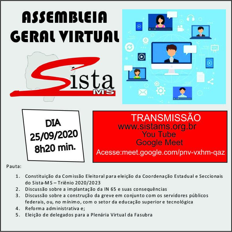Convocar todos os Trabalhadores em Educação da Fundação Universidade Federal de Mato Grosso do Sul, ativos, aposentados e pensionistas para a Assembleia Geral Extraordinária virtual, a realizar-se no dia 25 de setembro de 2020, às 08h30min, na Sede da Entidade, para deliberarem sobre a seguinte pauta: