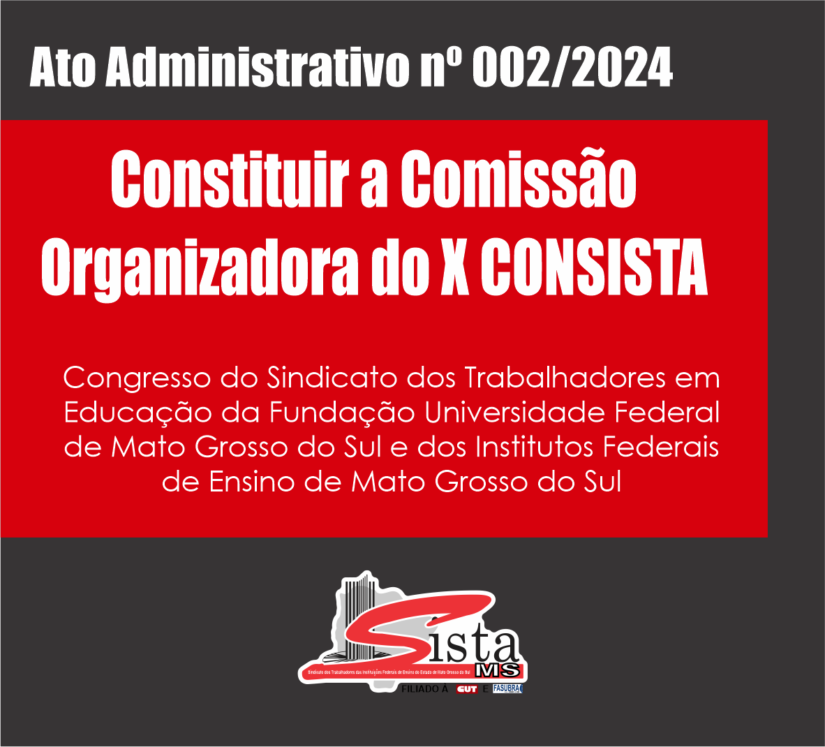 Constituir a Comissão Organizadora do X CONSISTA – Décimo Congresso do Sindicato dos Trabalhadores em Educação da Fundação Universidade Federal de Mato Grosso do Sul e dos Institutos Federais de Ensino de Mato Grosso do Sul, para dirigir e propor todas as ações necessárias para Organização e Realização do Congresso dos servidores Técnicos-Administrativos da Universidade Federal de Mato Grosso do Sul e Institutos Federais de Ensino de Mato Grosso do Sul, composto pelos seguintes membros abaixo relacionados: