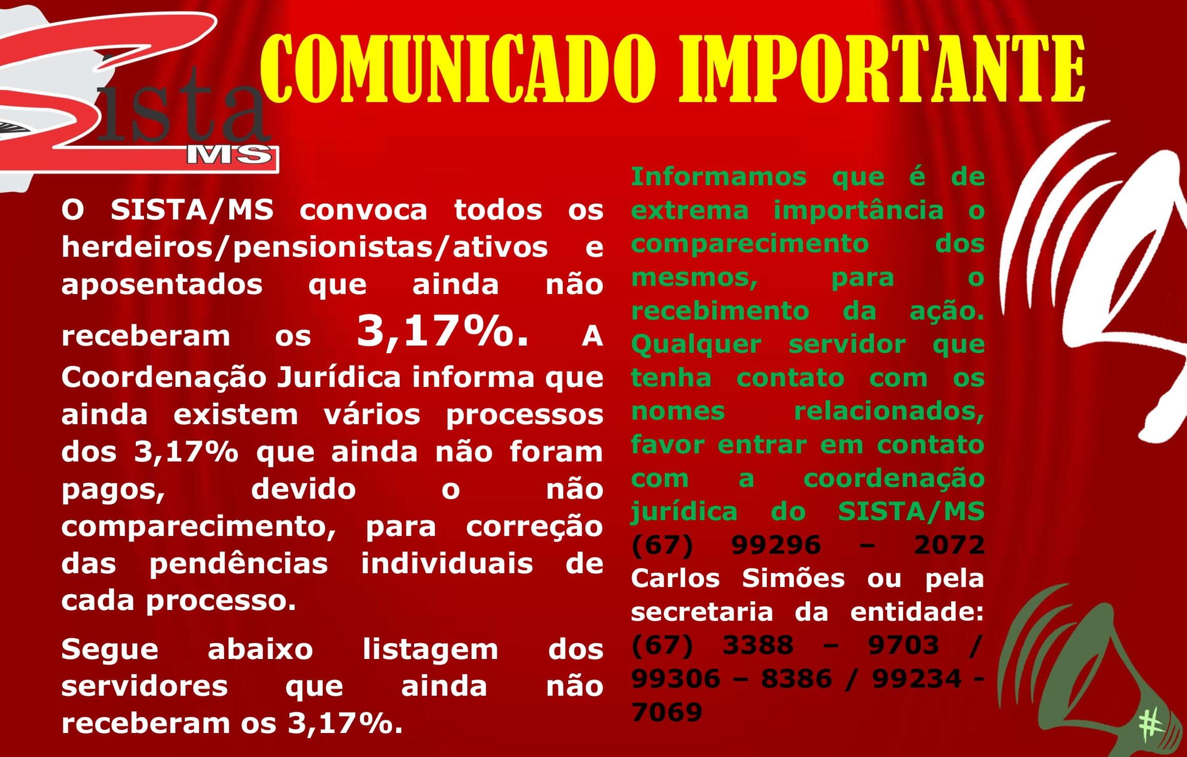 O SISTA/MS convoca todos os herdeiros/pensionistas/ativos e aposentados que ainda não receberam os 3,17%, para regularizarem suas pendências para recebimento do processo. A Coordenação Jurídica informa que ainda existem vários processos dos 3,17% que ainda não foram pagos, devido o não comparecimento dos autores, para correção das pendências.