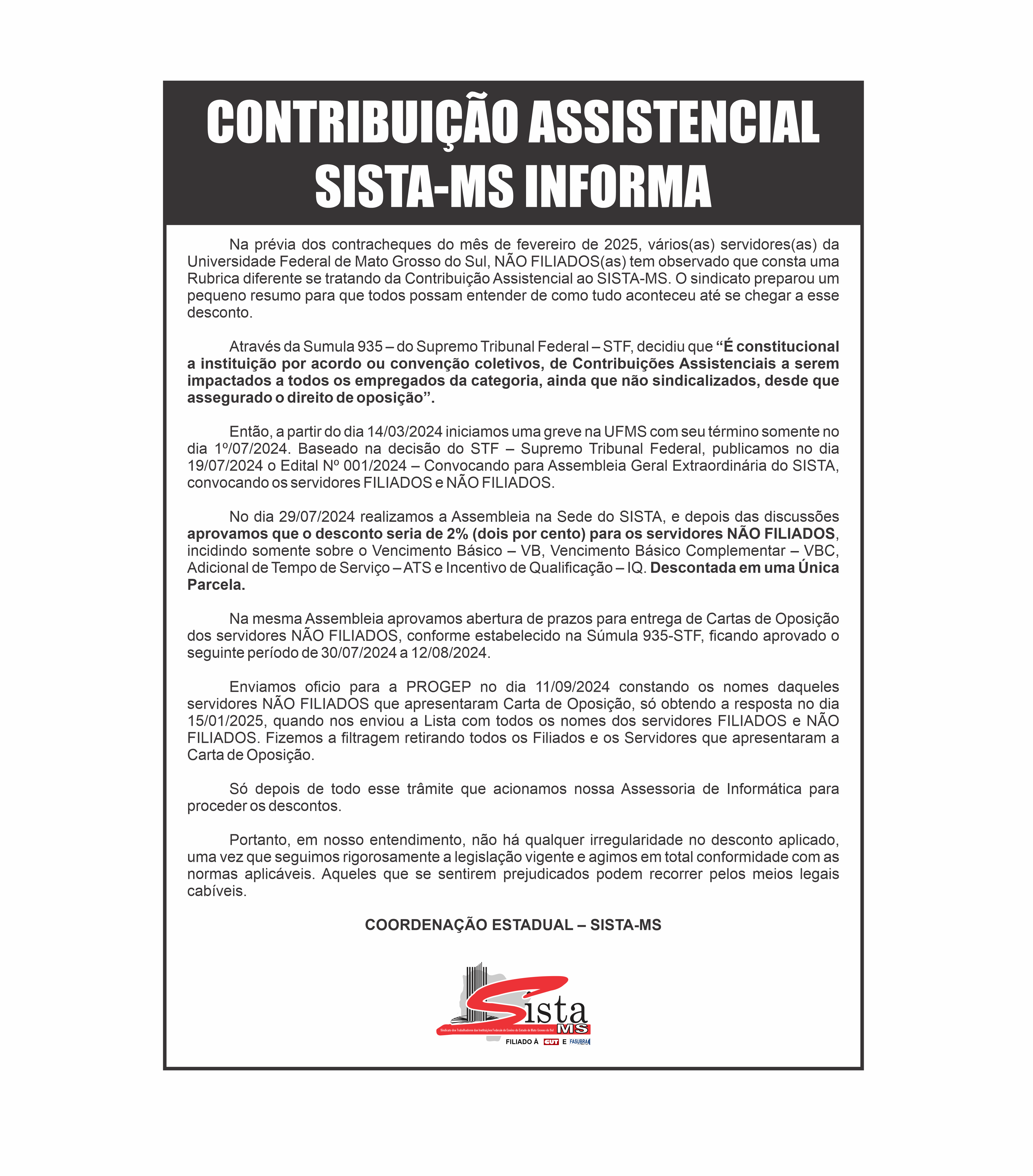 Na prévia dos contracheques do mês de fevereiro de 2025, vários(as) servidores(as) da Universidade Federal de Mato Grosso do Sul, NÃO FILIADOS(as) tem observado que consta uma Rubrica diferente se tratando da Contribuição Assistencial ao SISTA-MS. O sindicato preparou um pequeno resumo para que todos possam entender de como tudo aconteceu até se chegar a esse desconto.