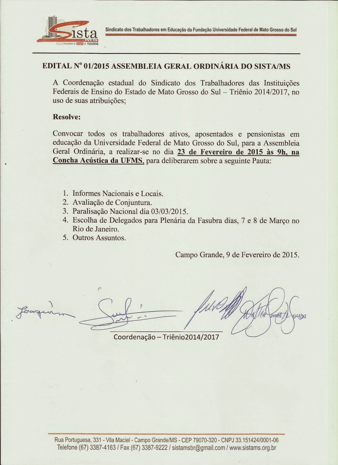 A Coordenação Estadual do Sindicato dos Trabalhadores das Instituições Federais de Ensino do Estado de Mato Grosso do Sul - Triênio 2014/2017, no uso de suas atribuições;Resolve:Convocar todos os trabalhadores ativos, aposentados e pensionistas em Educação da Fundação Universidade Federal de Mato Grosso do Sul, para a Assembleia Geral Ordinária, a realizar-se no dia 23 de fevereiro de 2015, às 09h, na Concha Acústica, para deliberarem sobre a seguinte pauta:- Informes Locais e Nacionais.