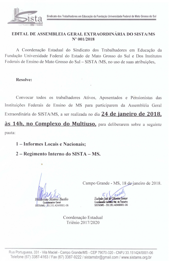 Edital da Assembleia para Definição do Novo Regimento do Sista