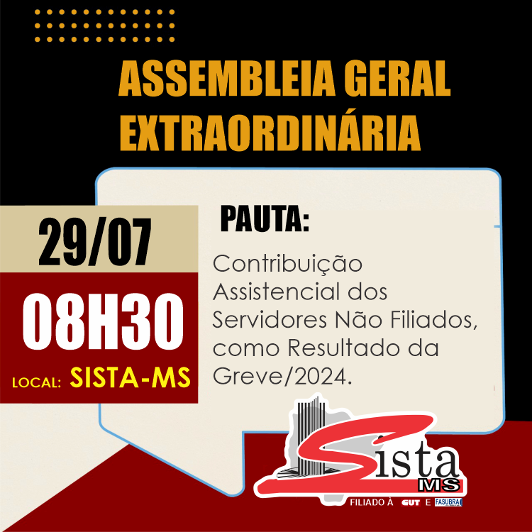Convocar todos os servidores Ativos, Aposentados e Pensionistas da Universidade Federal de Mato Grosso do Sul - UFMS, FILIADOS e NÃO FILIADOS do SISTA-MS, para participarem da Assembleia Geral Extraordinária do SISTA/MS, a ser realizada no dia 29 DE JULHO DE 2024, às 08h30min na Sede da Entidade, Rua Portuguesa, Nº 331, Vila Maciel, Campo Grande – MS, e simultaneamente nas Seccionais de Aquidauana, Corumbá e Três Lagoas, baseado na tese de repercussão geral fixada no Tema 935 pelo Supremo Tribunal Federal – STF, que afirma que: “É constitucional a instituição, por acordo ou convenção coletivos, de contribuições assistenciais a serem impostas a todos os empregados da categoria, ainda que não sindicalizados, desde que assegurado o direito de oposição”, para DELIBERAR sobre a seguinte pauta: