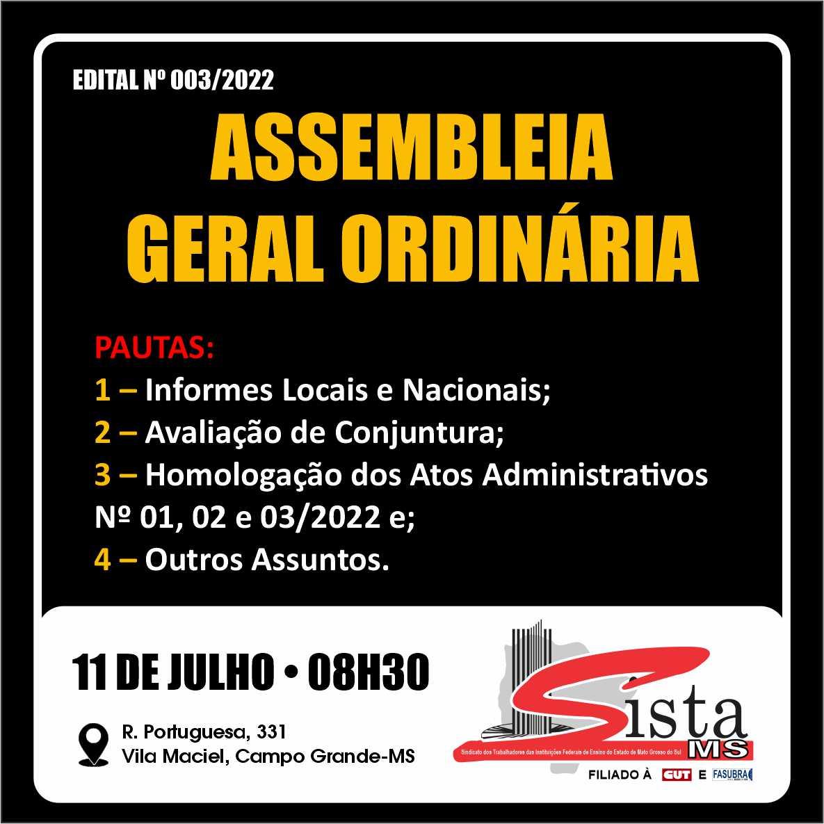 EDITAL Nº 003/2022 - ASSEMBLEIA GERAL ORDINÁRIA DO SISTA/MS