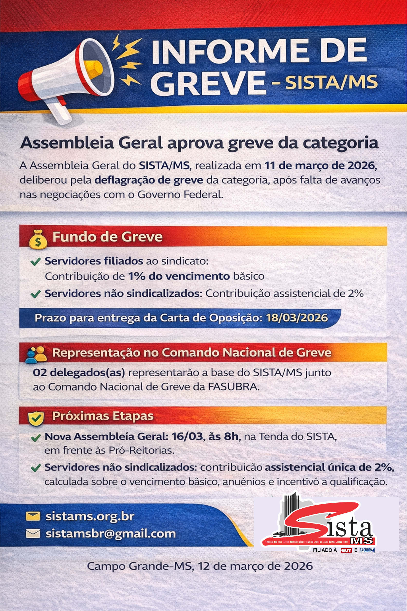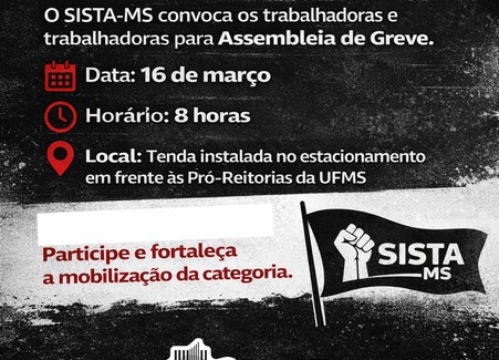 A greve integra um movimento nacional da categoria. Nesse contexto, foi convocada nova Assembleia Geral para o dia 16 de março, às 8h, na Tenda do SISTA, que será instalada em frente às Pró-Reitorias. Na ocasião, serão repassados novos informes e orientações nacionais sobre o andamento da greve.