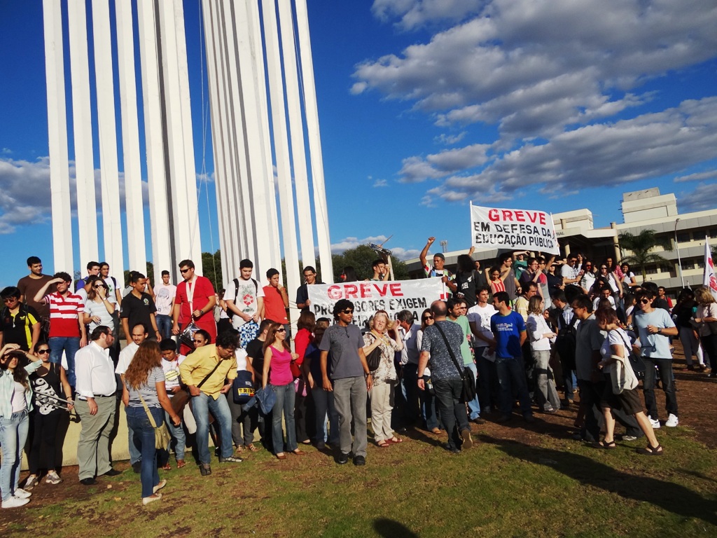 Do LAC, já com o apoio dos professores na passeata, os manifestantes passaram pelas Pró-Reitorias e em seguida até o “paliteiro”, em frente ao prédio da Biblioteca Central. Depois de passarem a faixa em volta do símbolo da UFMS, os manifestantes fizeram um minuto de silêncio em protesto pela morte da educação.