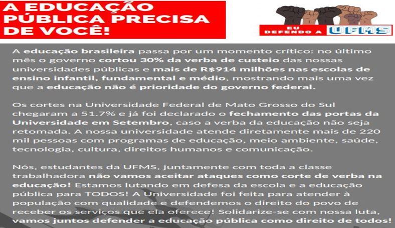 Milhares de estudantes, secundaristas e acadêmicos, professores e servidores da UFMS e de escolas públicas, entre outros profissionais ligados direto ou indiretamente à educação, participam nesta quinta-feira (30) de ato público às 15h na Praça Ary Coelho, em Campo Grande, e pelo interior de Mato Grosso do Sul, contra os cortes de recursos federais para a educação.
