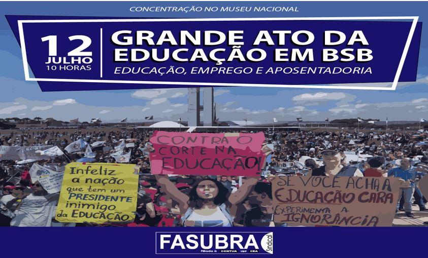 No próximo dia 12 de julho, as centrais e entidades sindicais realizam mais um grande ato da Educação em Brasília, com o tema: “Educação, Emprego e Aposentadoria”, a concentração será a partir das 10h, no Museu Nacional. O ato foi convocado pela UNE (União Nacional dos Estudantes) que realizará o congresso da entidade no período de 10 a 14 de julho, na capital do país, e será reforçado pelas demais entidades, entre elas a FASUBRA Sindical.