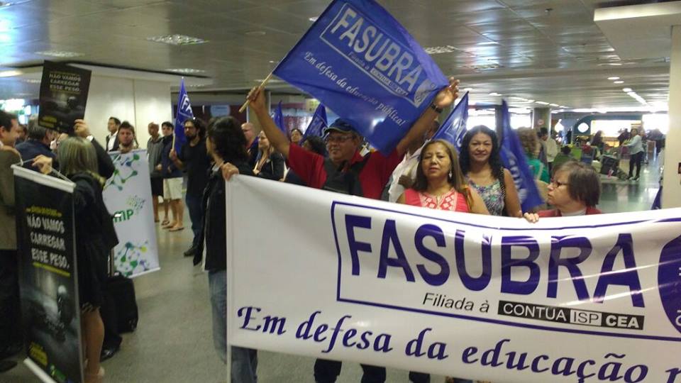 Uma delegação do SISTA/MS está em Brasília participando de uma mobilização convocada pela Federação. Nesta manhã, 01, a FASUBRA realiza panfletagem no aeroporto internacional de Brasília-DF contra o PLP 257/16, projeto que ameaça a classe trabalhadora e retira direitos conquistados com muita luta ao longo dos anos.