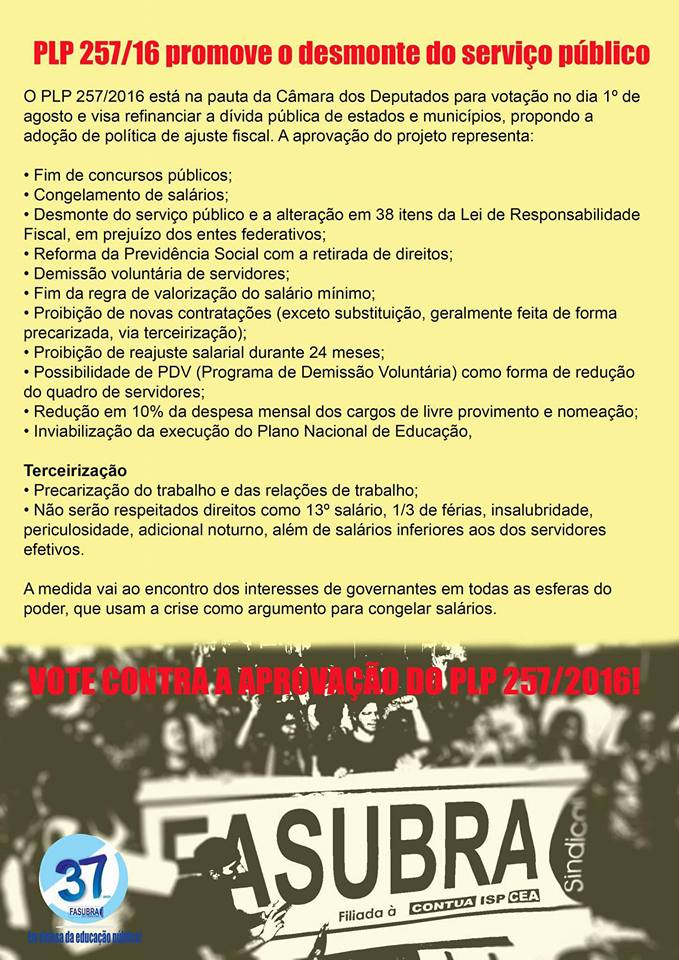 A votação do PLP 257/16 ocorre hoje, às 16h em sessão extraordinária da Câmara dos Deputados.